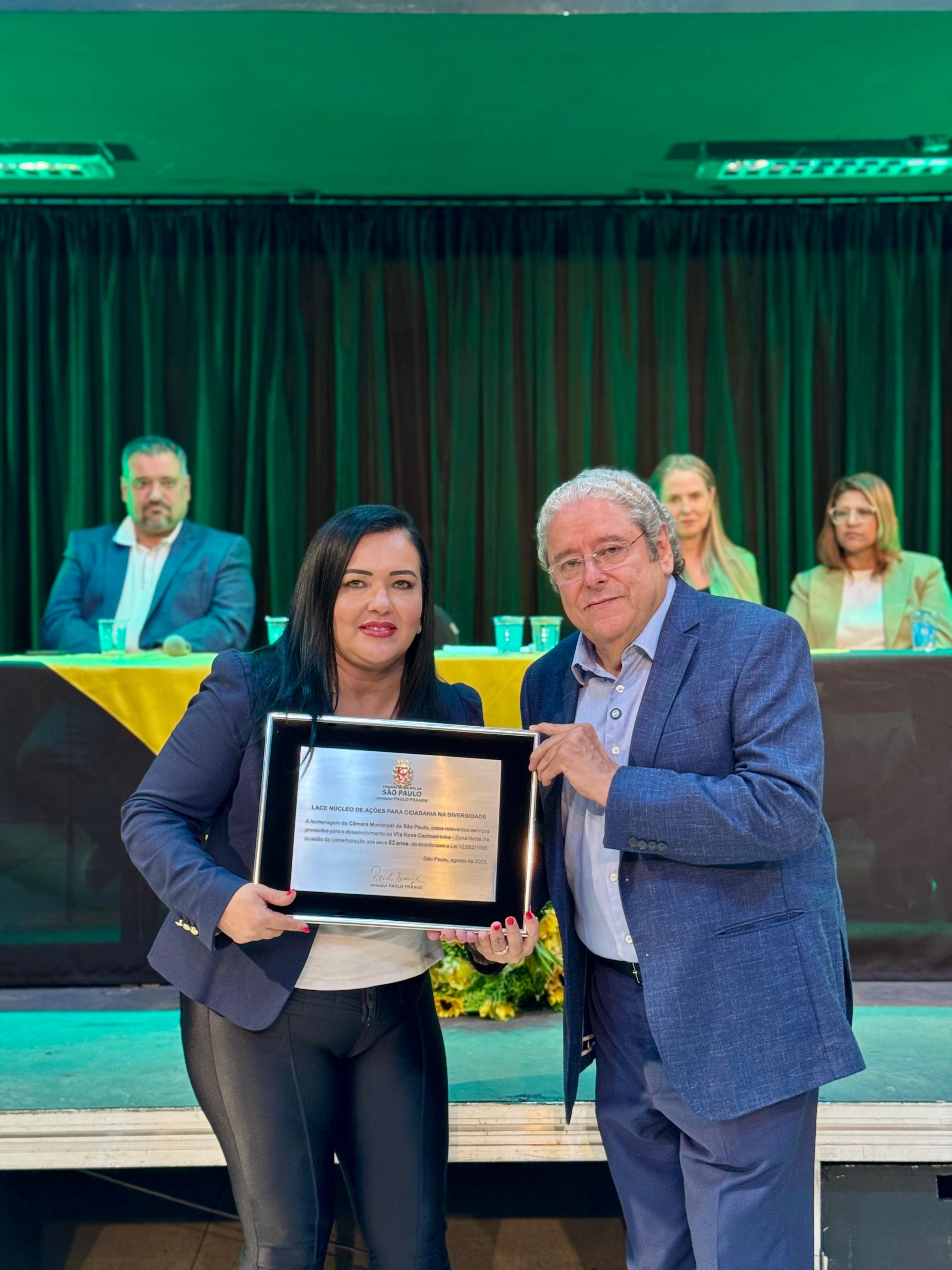 Compuseram a mesa solene o subprefeito de Casa Verde/Limão/Cachoeirinha, Eduardo Valentim Fernandes Pereira, representando o prefeito Ricardo Nunes, e o vereador Paulo Frange, proponente e presidente da sessão. Também integraram a mesa a professora Jussara Maciel Cardoso, diretora regional de Educação Freguesia do Ó/Brasilândia; Rubens Morais, gestor da Fábrica de Cultura Vila Nova Cachoeirinha e anfitrião da cerimônia; a delegada Dra. Marly Gomes do Amaral, titular do 38º Distrito Policial, e Fabiana Tereza dos Santos Andrade Borges, do LACE – Núcleo de Ações para Cidadania na Diversidade, que também foram homenageadas na solenidade.